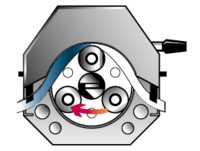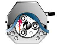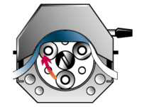 | 轉子上的轉輪依次碾過泵管,將管中的流體向前推擠。轉輪碾過后的泵管因自身彈性恢復原形、在泵管吸入端形成真空,液體因為真空而被吸入。 |