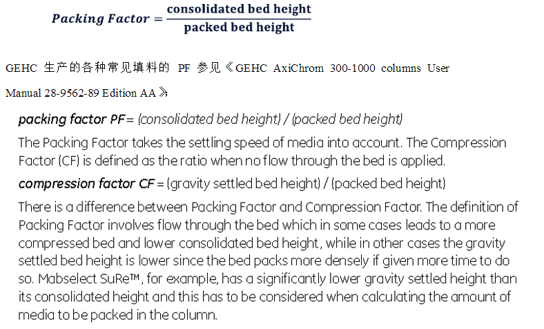 填料因子(Packing Factor, PF):指在在裝柱過(guò)程中,用低流速(如60cm/h)對(duì)填料進(jìn)行沉降壓縮得到的調(diào)料高度和**后裝柱完成時(shí)填料高度(柱高)的比值,