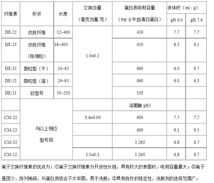 在交換纖維素中,**常用的是DEAE—纖維素和CM纖維素。由于劑型不同,其理化性質和作用也有所差異。一般而言,微粒型要優于纖維素型,因為微粒型是在纖維素型的基礎上進一步提煉而成。它的交換容量大,粒細、比重大,能裝成緊密的層析柱,要求分辨力高的實驗可用此型纖維素(見表1-2)。