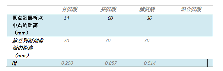 求出此值,即得氨基酸的Rf值,計算出4種氨基酸在酸系統中的Rf值。
