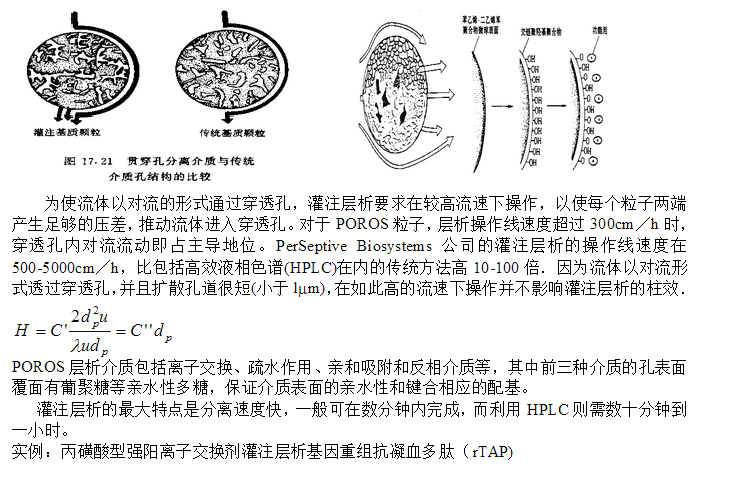 灌注層析(Perfusion chromatography)是美*PerSeptive Biosystems公司于1989年開發的層析分離技術,Perfusion chromatography是該公司的注冊商標.灌注層析的關鍵是其以POROS命名的固定相粒子的特殊結構;POROS的基質是聚苯乙烯—二乙烯苯,含有兩種大小不同的孔道。大孔直徑為0.6 ~ 0.8?m,流體以對流形式通過,稱為穿透孔(throughpore); 小孔直徑與一般介質一樣,直徑500 ~ 1000 , 流體以擴散的形式通過,稱為擴散孔(diffusive pore).如圖所示,穿透孔之間以擴散孔相連,保證了