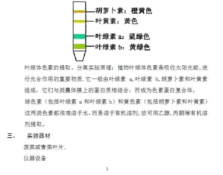 藥品試劑:①無水乙醇和丙酮;②石英砂;③碳酸鈣;④層析液:石油醚10ml+丙酮2ml+苯1ml. 四、