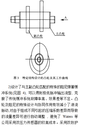 恒流泵采用特殊設(shè)計(jì)的往復(fù)式雙柱塞系統(tǒng), 凸輪和緩沖器耦合緩沖技術(shù)結(jié)合直流電機(jī)動力系統(tǒng) ,可獲得低脈沖極穩(wěn)定的液流。兩級密封圈和浮動式泵頭的結(jié)構(gòu)設(shè)計(jì)也使柱塞桿和密封圈壽命延長 ,且機(jī)械噪聲極低。