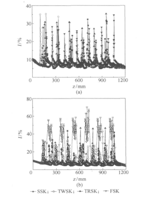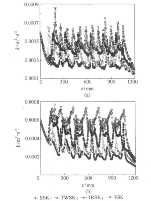 如下 :一方面是由于一個截面上葉片的數(shù)量越多, 對流體的擾動程度越大 ,使流體的平均湍動程度加大 ; 另一方面是由于一個截面上葉片的數(shù)量越多, 在每組元件的入口位置引起的湍動尖峰越高, 也使流體的平均湍動程度加大。